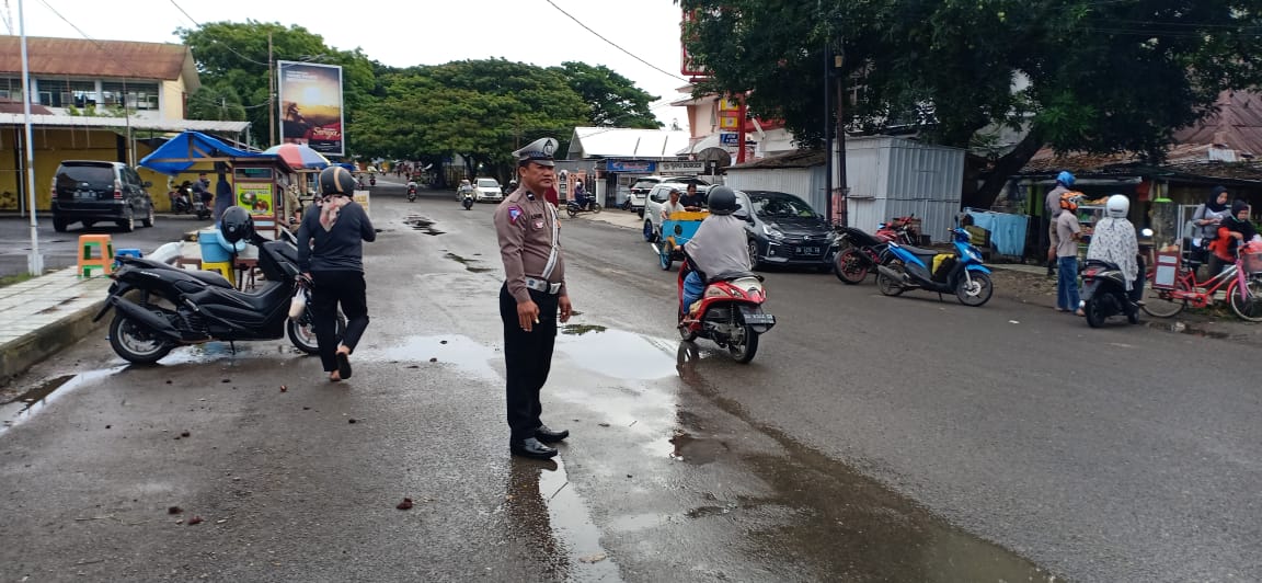 Pagi hari aktifitas warga di pasar ramai kendaraan sehingga Polantas hadir untuk mengantisipasi terjadinya kemacetan dan kecelakaan lalu lintas di jalan raya.