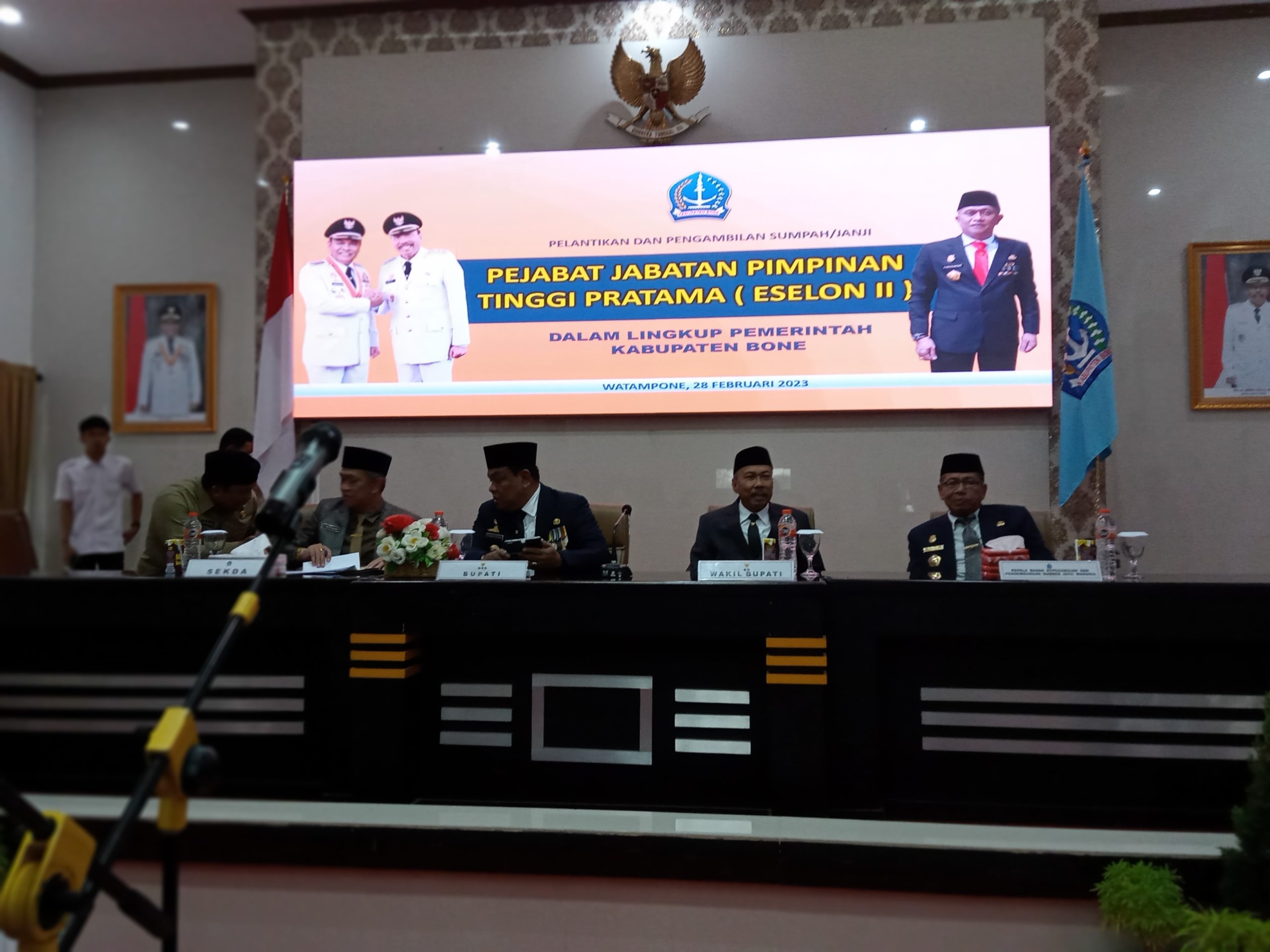 Pelantikan dan pengambilan sumpah 11 pimpinan tinggi Pratama Eselon Dua dilingkup pemerintah kabupaten Bone yang di lakukan Bupati Bone Dr.Andi Fashar Mahdin Padlangi di Baruga La Teya riduni kompleks Rumah Jabatan Bupati Bone Jalan petta Poggawae Kelurahan Watampone Kecamatan Tanete Riattang Kabupaten Bone , Selasa 28/02/2023 pukul 10.00 WITA .