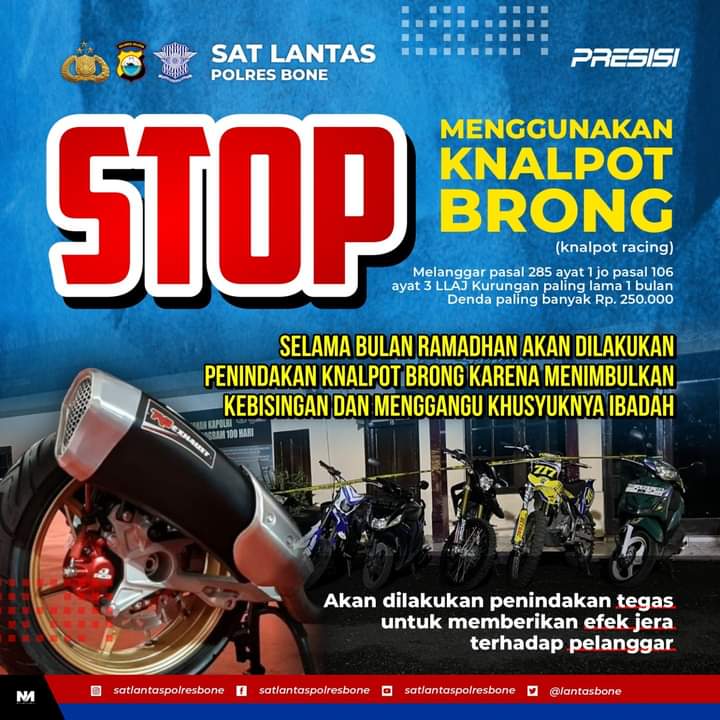 Satlantas Polres Bone jajaran Polda Sulsel akan menindak tegas kendaraan yang memakai knalpot racing (brong) demi meningkatkan kenyamanan masyarakat yang melaksanakan ibadah dan pengguna jalan lain.