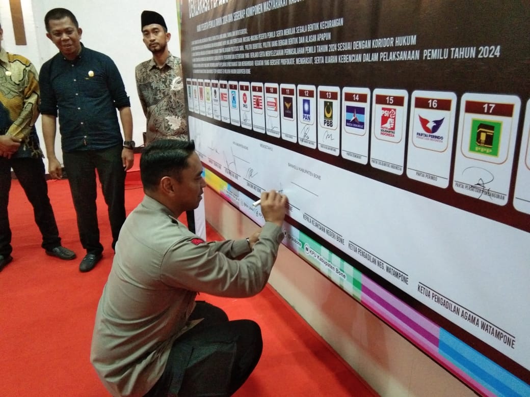 Setelah pembacaan deklarasi, peserta acara menandatangani deklarasi ini sebagai bentuk komitmen bersama untuk menjaga Pemilu Tahun 2024 di Kabupaten Bone tetap damai, adil, dan berintegritas. Dengan semangat ini, Kabupaten Bone berharap dapat memberikan contoh positif dalam pelaksanaan pemilu di Indonesia.