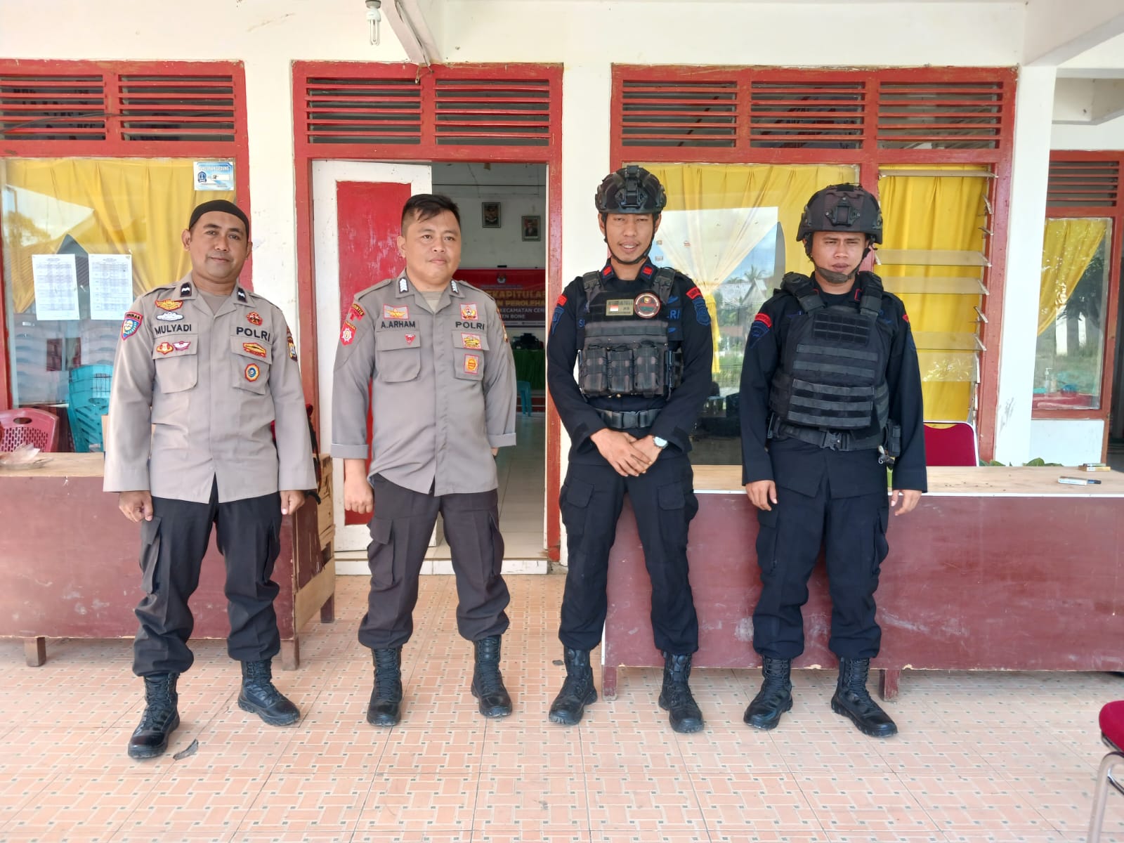 BONE – Cenrana. Pasca Pencoblosan pemilu 2024 , personil Polsek Cenrana Polres Bone bersama dengan personil Sat Brimobda Batalyon C Pelopor Polda Sulsel melakukan pengamanan di sekretariat PPK Cenrana di Kelurahan Ujung Tanah Kecamatan Cenrana Kabupaten Bone. Senin (19/02/2024).