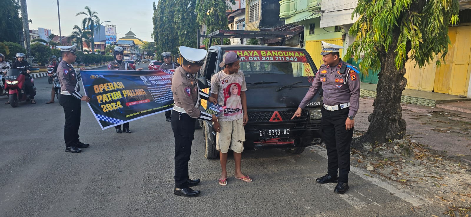 Di sini, personel Satlantas Polres Bone membentangkan spanduk dan membagikan brosur Operasi Patuh Pallawa kepada para pengendara mobil dan motor yang berhenti di traffic light.