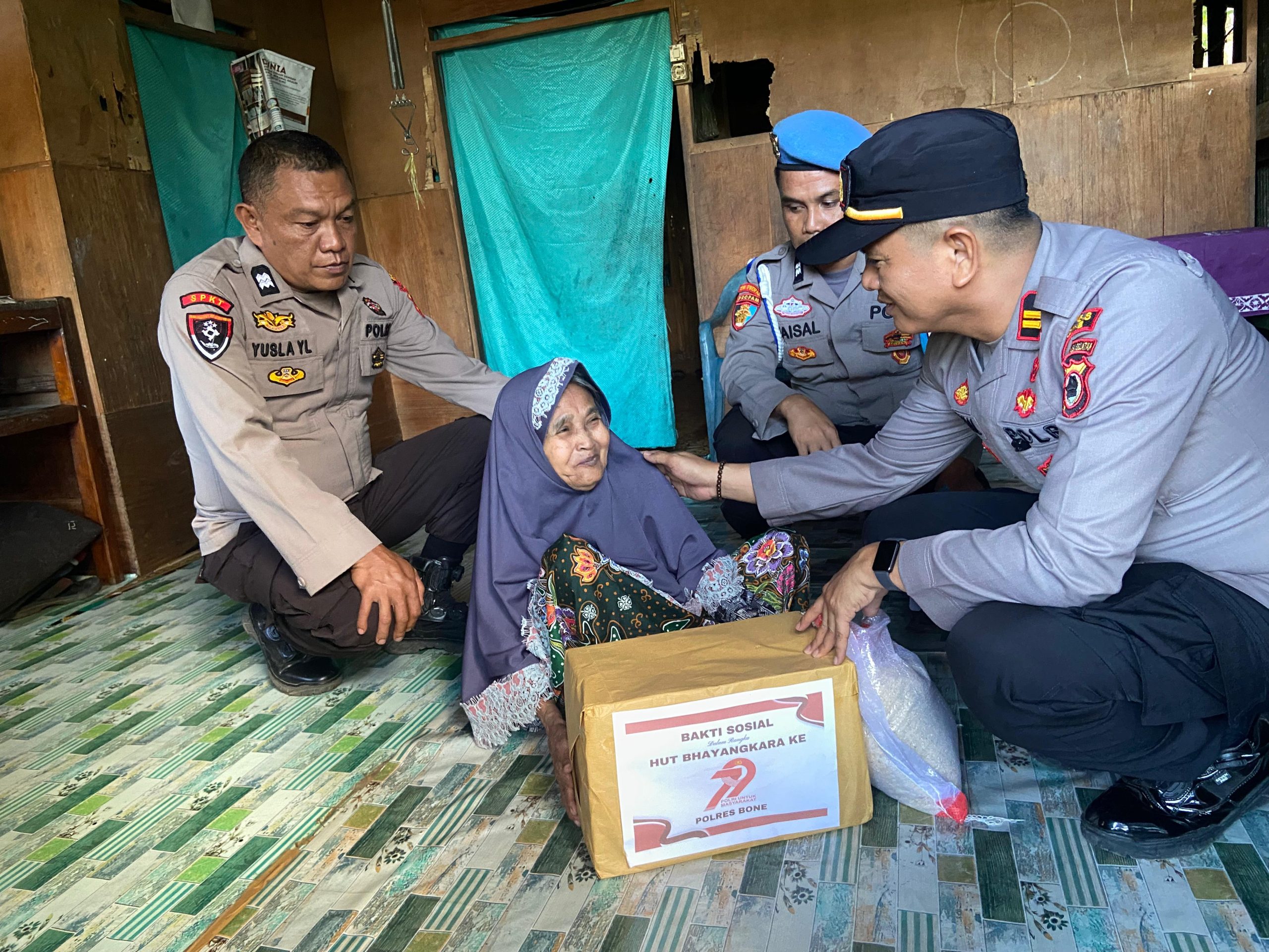 BONE — Dalam rangka memperingati Hari Ulang Tahun (HUT) Bhayangkara ke-79 , Kapolsek Bontocani Polres Bone Iptu Kamaluddin, S.H memimpin langsung kegiatan bakti sosial pembagian sembako kepada masyarakat kurang mampu di wilayah hukum Polsek Bontocani.(17/06)
