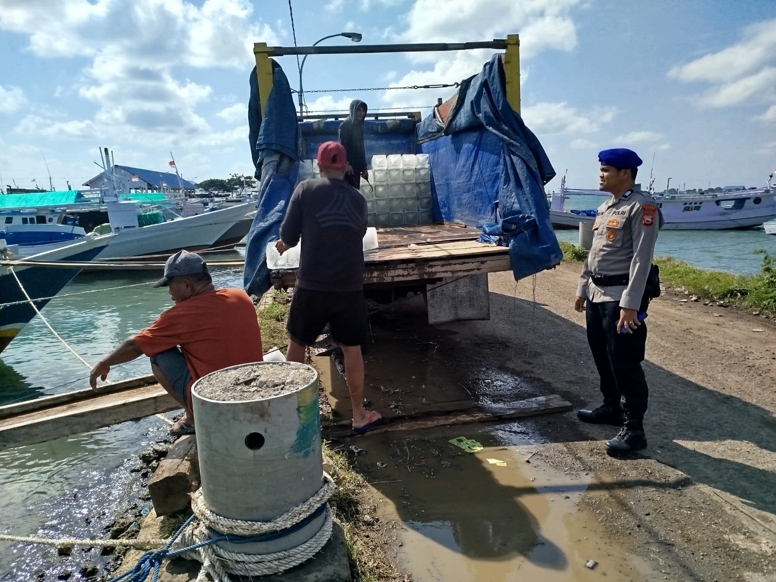 Dalam kegiatan Polmasnya, Brigpol Aryo bersama anggotanya memantau langsung aktivitas bongkar muat barang dari mobil ke kapal dan mengecek barang yang diangkut sekaligus memberikan himbauan kamtibmas kepada buruh pelabuhan.