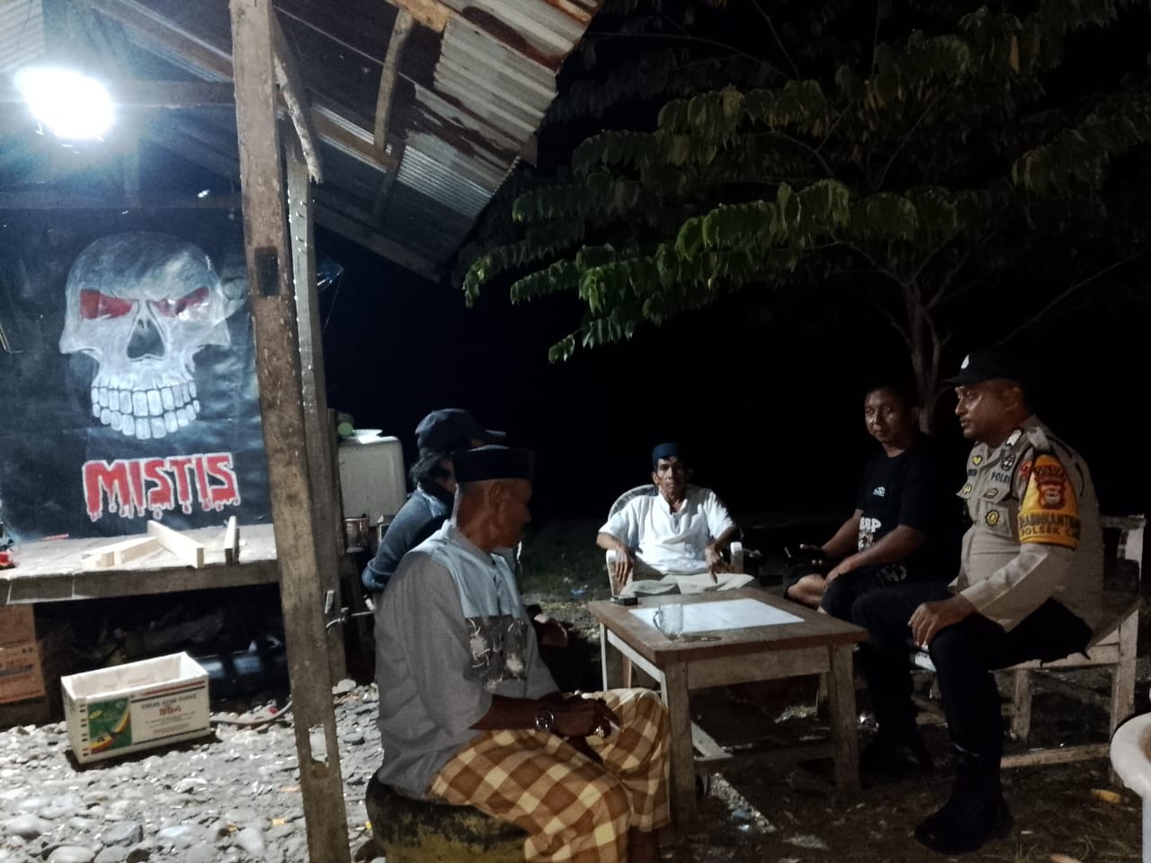 BONE – Pada malam hari, Bhabinkamtibmas Polsek Cina Desa Arasoe Polres Bone, Bripka Rusdi, melaksanakan kegiatan Pembinaan Pos Satkamling di Dusun Arasoe, Desa Arasoe, Kecamatan Cina, Kabupaten Bone.