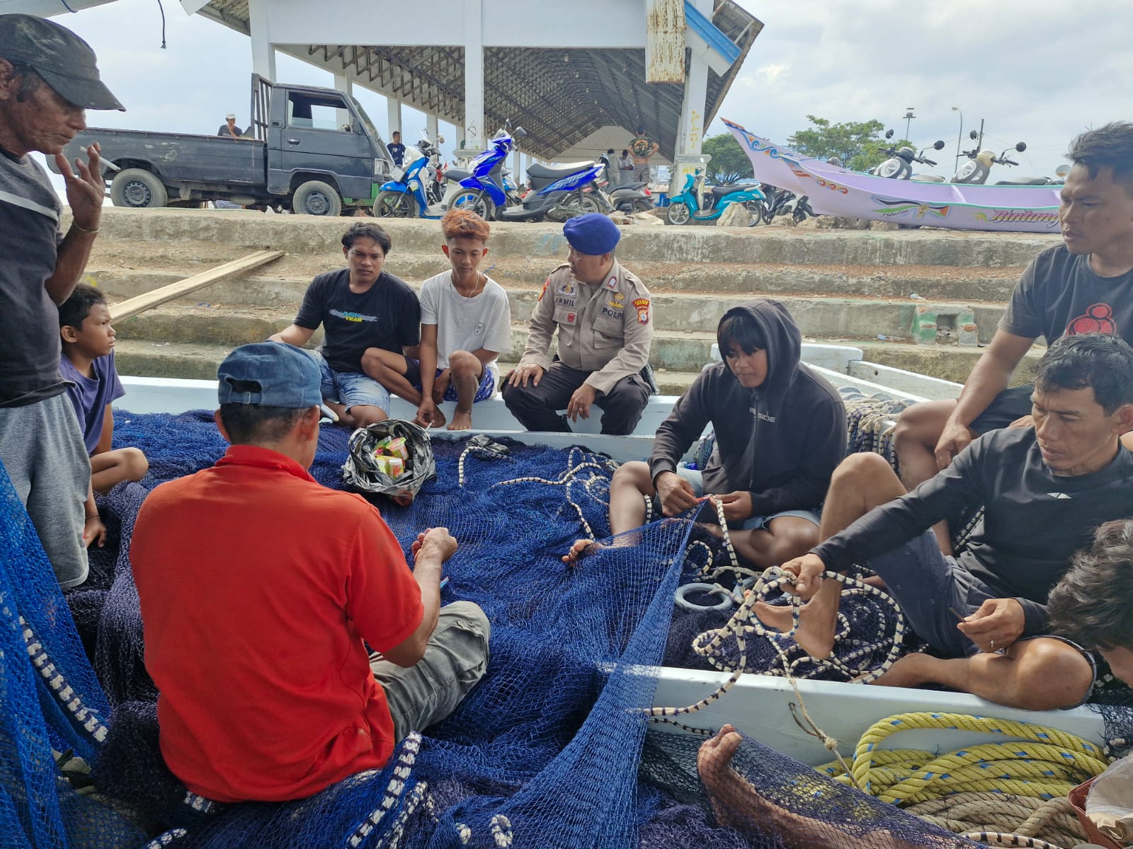 Disela kegiatannya, ia menyambangi masyarakat nelayan yang sedang beraktivitas memperbaiki jaring ikan untuk memberikan himbauan kamtibmas perairan.