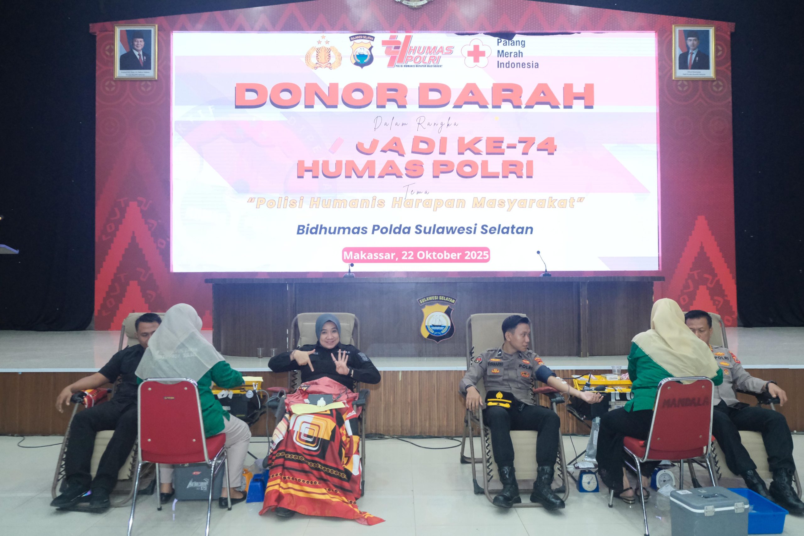 Dalam rangka memperingati Hari Jadi Humas Polri ke-74 yang mengusung tema “Polisi Humanis Harapan Masyarakat”, Bidang Humas Polda Sulawesi Selatan menggelar kegiatan sosial donor darah di Aula Mappaodang, Mapolda Sulsel, Rabu (22/10/2025).