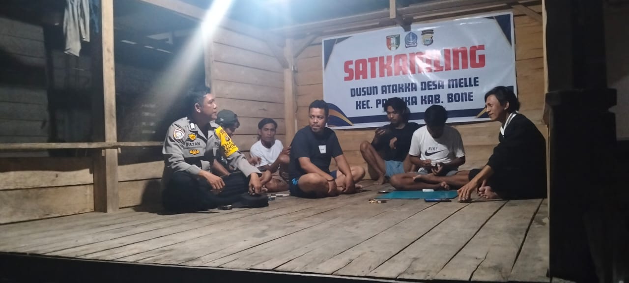 BONE – Dalam upaya menjaga situasi keamanan dan ketertiban masyarakat (Kamtibmas) tetap kondusif di wilayah binaannya, Bhabinkamtibmas Desa Melle Polsek Palakka Polrers Bone, Bripka Sultan, melaksanakan kegiatan sambang dan memberikan himbauan kepada warga di Pos Kamling desa setempat.