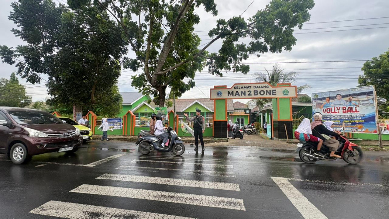 BONE – Personel Sat Samapta Polres Bone Polda Sulawesi Selatan laksanakan pengaturan pagi dan himbauan lalu lintas di Kota Watampone, Senin (09/02/2026).