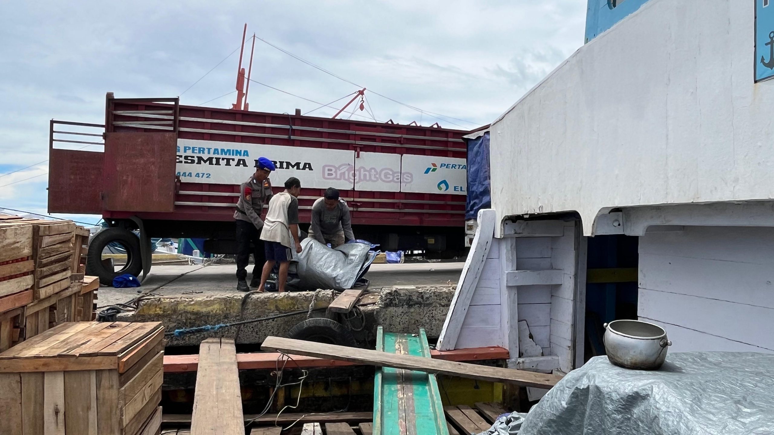 Melalui program Polisi Penolong, personel Satpolairud terlihat membantu mengangkat barang dan papan dari mobil untuk dinaikkan keatas kapal.