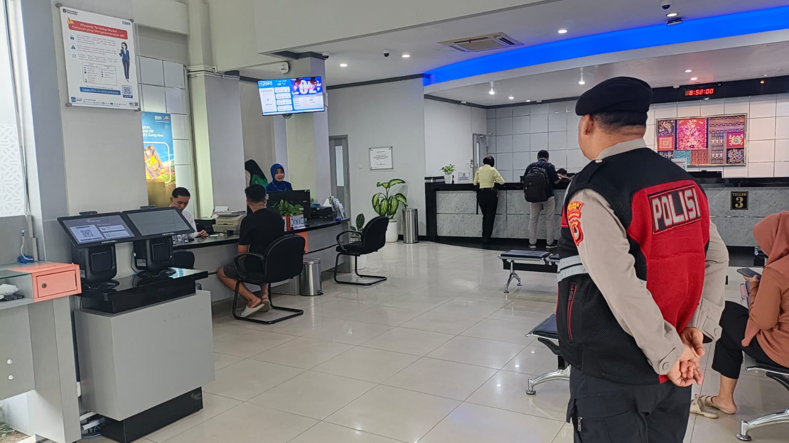 “Nasabah di Bank BRI cukup ramai dan untuk antisipasi hal yanng tidak di inginkan terjadi, kami petugas jaga bersama security selalu menghimbau karyawan maupun nasabah yang untuk selalu berhati hati saat melaksanakan kegiatan”, ungkap Bripka Nanang Pujiantoro yang dimintai informasi lewat via telpon.