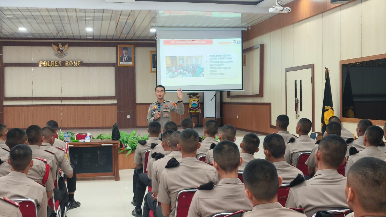 BONE – Pada hari Senin, 27 April 2026, bertempat di Aula Polres Bone, KBO Sat Binmas Polres Bone, IPDA Agus Salim bersama Kanit Binkamsa Sat Binmas, IPDA Suhati, memberikan materi pelatihan Fungsi Teknis Binmas kepada Siswa Latja Diktuk Bintara T.A. 2026.