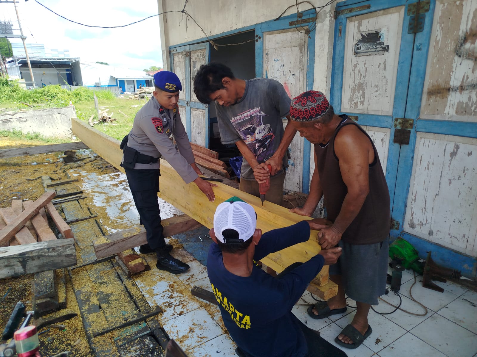 Dalam kegiatan yang dikemas melalui program Polisi Penolong ini, Abripda Kaharuddin membantu nelayan membuat papan seluncuran es balok untuk digunakan nelayan ketika hendak memuat es balok ke atas kapal.